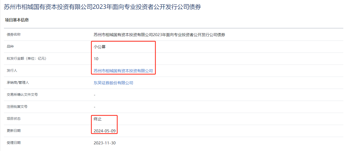 上交所披露,终止审核“苏州市相城国有资本投资有限公司2023年面向专业投资者公开发行公司债券”、“长沙市望城区城市发展集团有限公司2023年面向专业投资者非公开发行绿色公司债券”项目,金额分别为10亿元、17亿元,品种分别为小公募、私募。