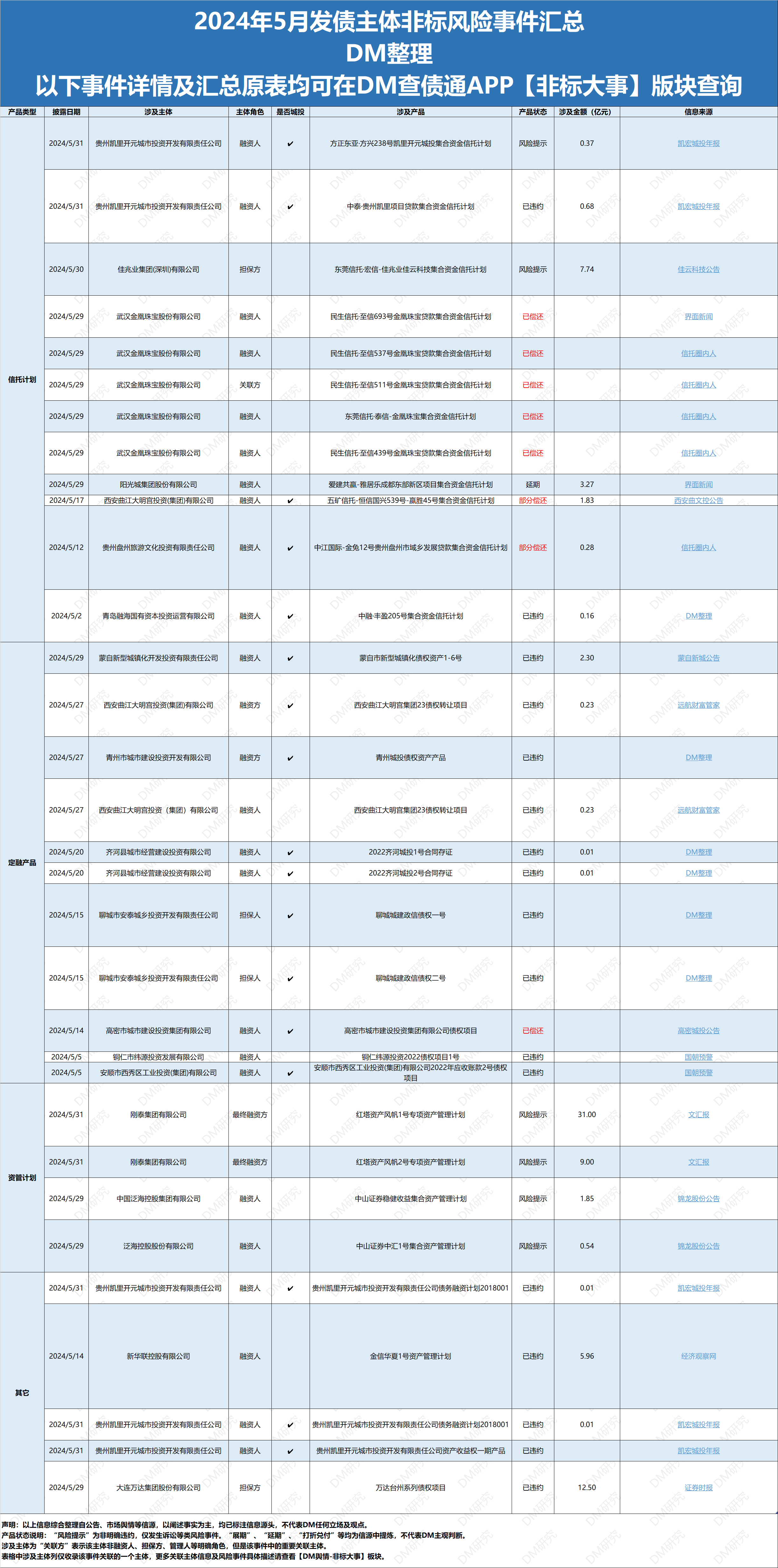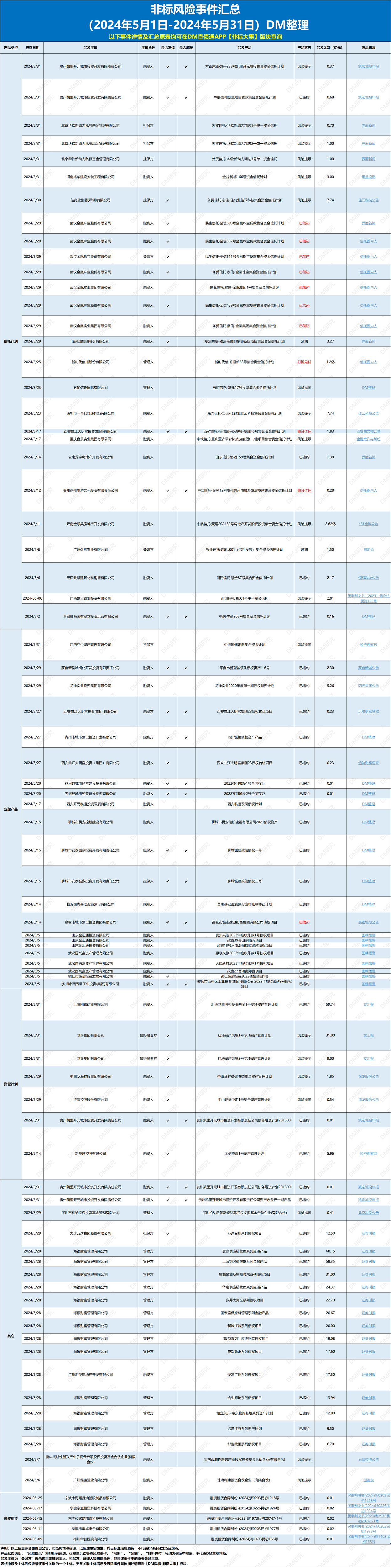本篇发布于【非标大事】专栏点击附件可查看Excel原表(附事件详情)据DM不完全统计,2024年5月共有82笔非标风险事件,其中信托项目27笔,定融产品23笔,资管计划7笔,融资租赁5笔,其它产品20笔。