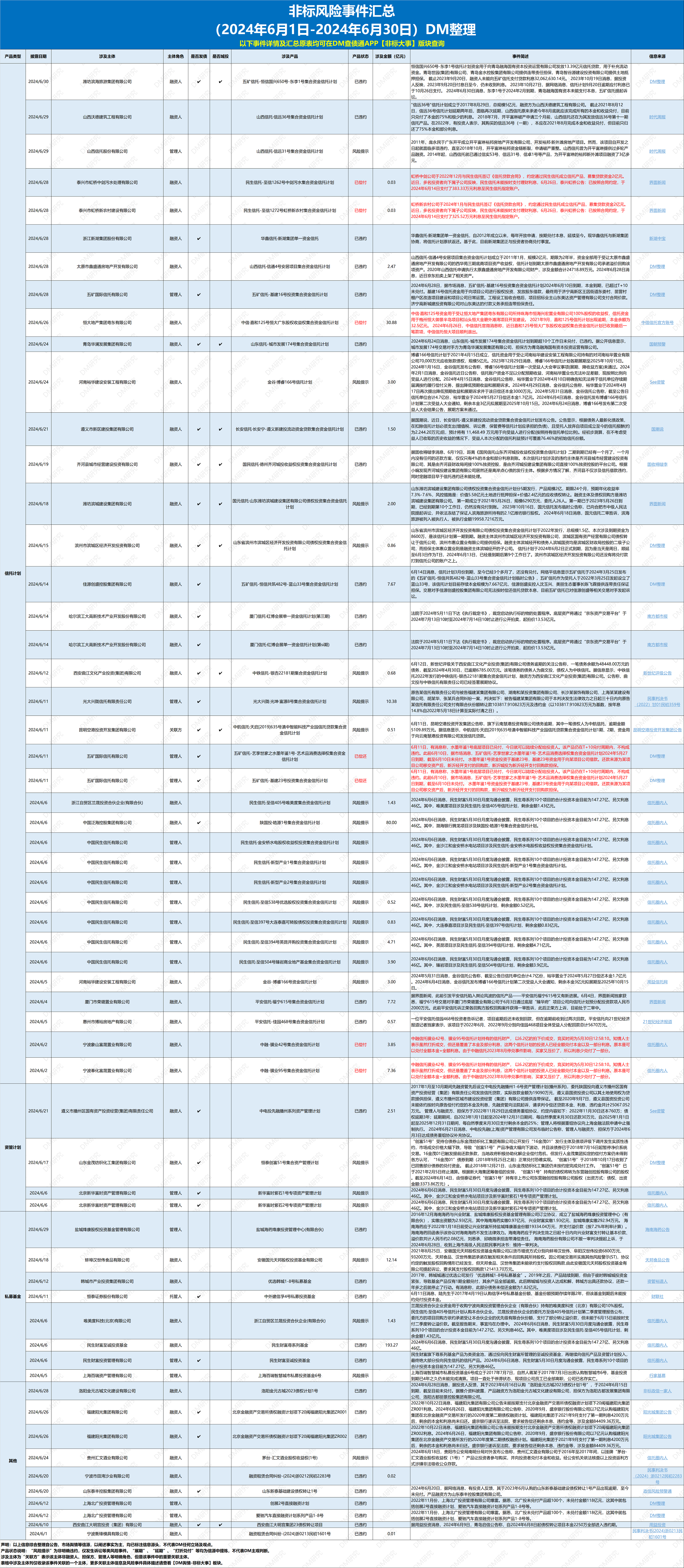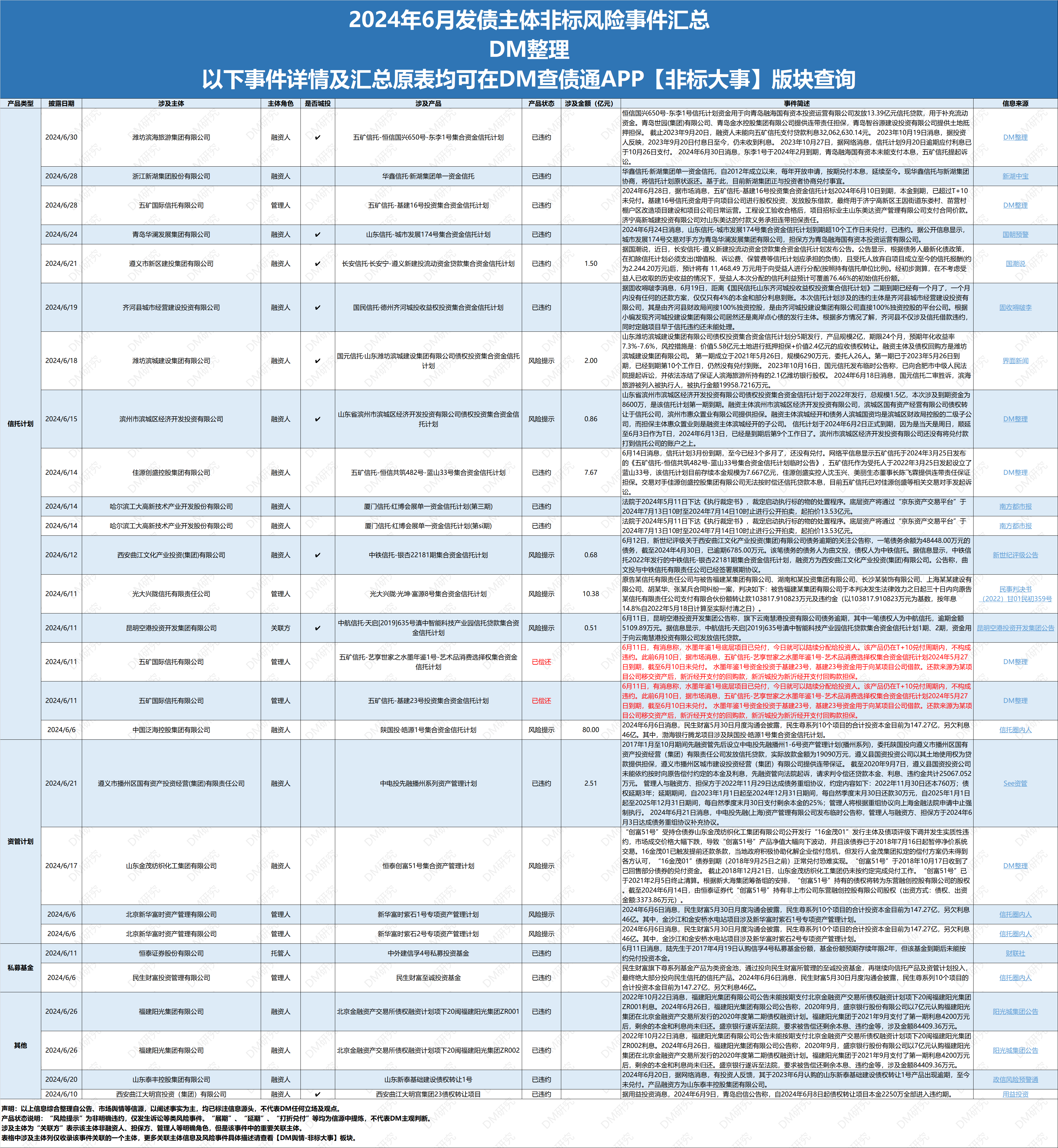 据DM不完全统计,2024年6月共有59笔非标风险事件,其中信托项目37笔,私募基金8笔,资管计划4笔,其它产品10笔。