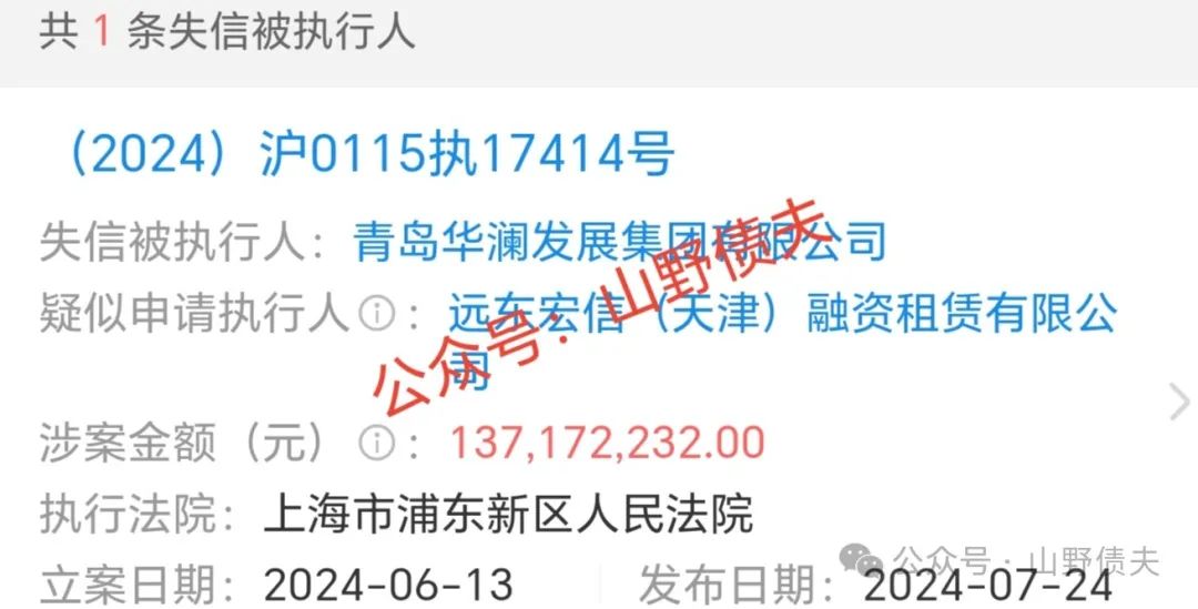 据山野债夫获悉,青岛华澜发展集团有限公司因与远东宏信租赁公司之间产生债务纠纷,涉案金额1.37亿,目前已被上海浦东新区人民法院列为失信被执行人(即有履行能力而拒不履行生效法律文书确定义务),拉入“黑名单”,也就是我们通俗意义上说的欠债不还的“老赖”。