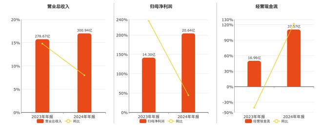 公司营业总收入为300.94亿元,在已披露的同业公司中排名第12,较去年同报告期营业总收入增加22.27亿元,实现5年连续上涨,同比较去年同期上涨7.99%。归母净利润为20.64亿元,在已披露的同业公司中排名第13,较去年同报告期归母净利润增加6.34亿元,实现3年连续上涨,同比较去年同期上涨44.36%。经营活动现金净流入为37.57亿元,在已披露的同业公司中排名第20,较去年同报告期经营活动现金净流入增加20.62亿元,同比较去年同期上涨121.57%。